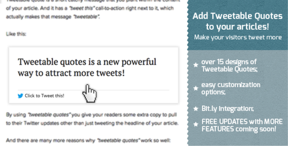 TweetDis is a fairly simple and easy-to-use WordPress that allows you to add beautiful tweet boxes within your blog posts. It not only reduces the bounce rate your website gets, but adding these tweet boxes also increase user-engagement, credibility, exposure, and social media shares.